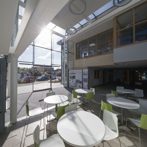 The new church & community centre provides a spacious two storey facility, lightly linked to the existing church with a double height structural glass atrium, exploiting the site levels to allow the new church centre to be visually subservient to the existing Georgian building. Large areas of natural stonework and glazed curtain walling provide high levels of daylight internally and extensive views into the parkland setting. The new building provides a large children's centre, offices, meeting rooms, fellowship and seminar spaces, a commercial kitchen and associated sanitary facilities. Flexibly planned sliding/folding acoustic walls enable the whole ground and first floor spaces to be opened up for large functions and special events. The spacious stairs and lift within the new atrium provide access to all levels.
